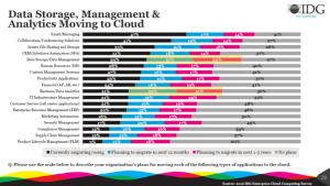 Among the organizations that responded to the survey, the predictions for cloud migration of business/data analytics and data storage/management applications were found to be 22% and 21% respectively. The following chart gives the detailed split of cloud-migration data as per the business area.